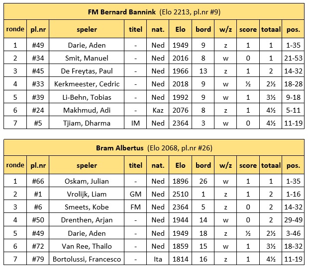 Bert speelde tegen FIDE-meester Hajo Jolles. Bert: Ik kwam gelijk uit de opening. Daarna kwam ik iets onder druk te staan, maar mijn tegenstander verloor daarbij een pion. Vlak daarna won ik een tweede pion. Mijn tegenstander verbruikte veel tijd en met nog 3 zetten te gaan voor de tijdcontrole verloor hij in slechte stand (-1,9) op tijd. Een lekkere overwinning tegen een sterke tegenstander! 3½-1½
