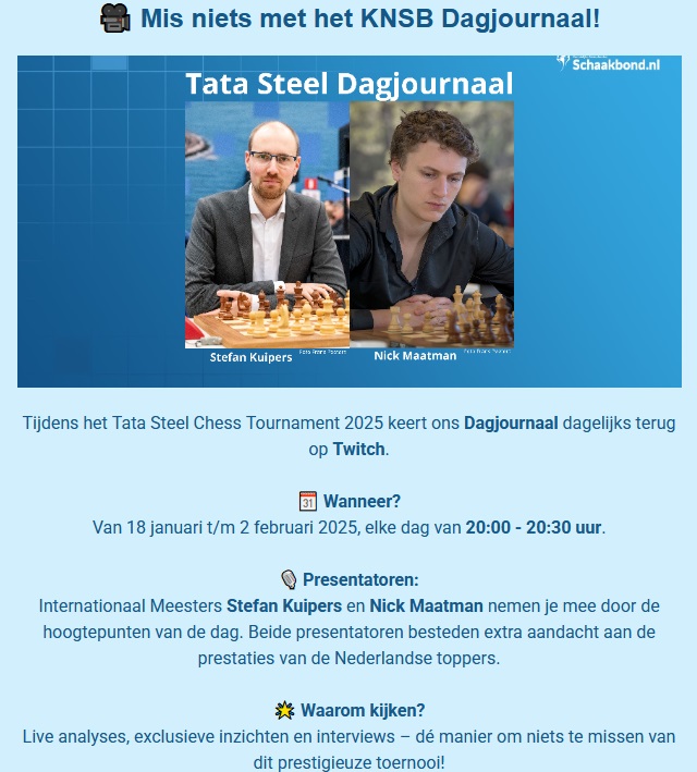 (RdV) – Met Chess.com als sponsor werd vandaag (zaterdag 4 januari) het Botwinnik Rapidtoernooi 2025 gespeeld, met in de A-groep (80 deelnemers) de Promotianen Bernard Bannink en Bram Albertus. Er waren 7 ronden, met speeltempo 15 minuten p.p. + 5 sec./zet. Beiden eindigden met 4½ punt op plaats 11-19.