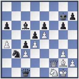 Sjaak Sibbing was als eerste klaar: remise tegen William van Zanten. Daarna volgde de eerste overwinning. De tegenstander van Jaap van den Berg liep een matnet in wat Jaap niet onbenut liet. In het diagram de stelling na 30. Df2+ Kg7. Na 31. Df6+ speelde mijn tegenstander 31. … Kh6. Daarna was het snel uit: 32. Df8+ Kg5, 33. h4+ Kg4, 34. Df3# mat.