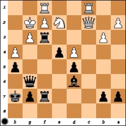 In deze stelling speelde zwart 28. … Df5. Zwart dreigt op f2 te slaan, dus het witte paard moet weg. 29. Pg1. Wat nu? Na een paar minuten nadenken vond ik de volgende combinatie. 29. … Lxg3, 30. Pxf3 Dxf3+, 31 Kg1.