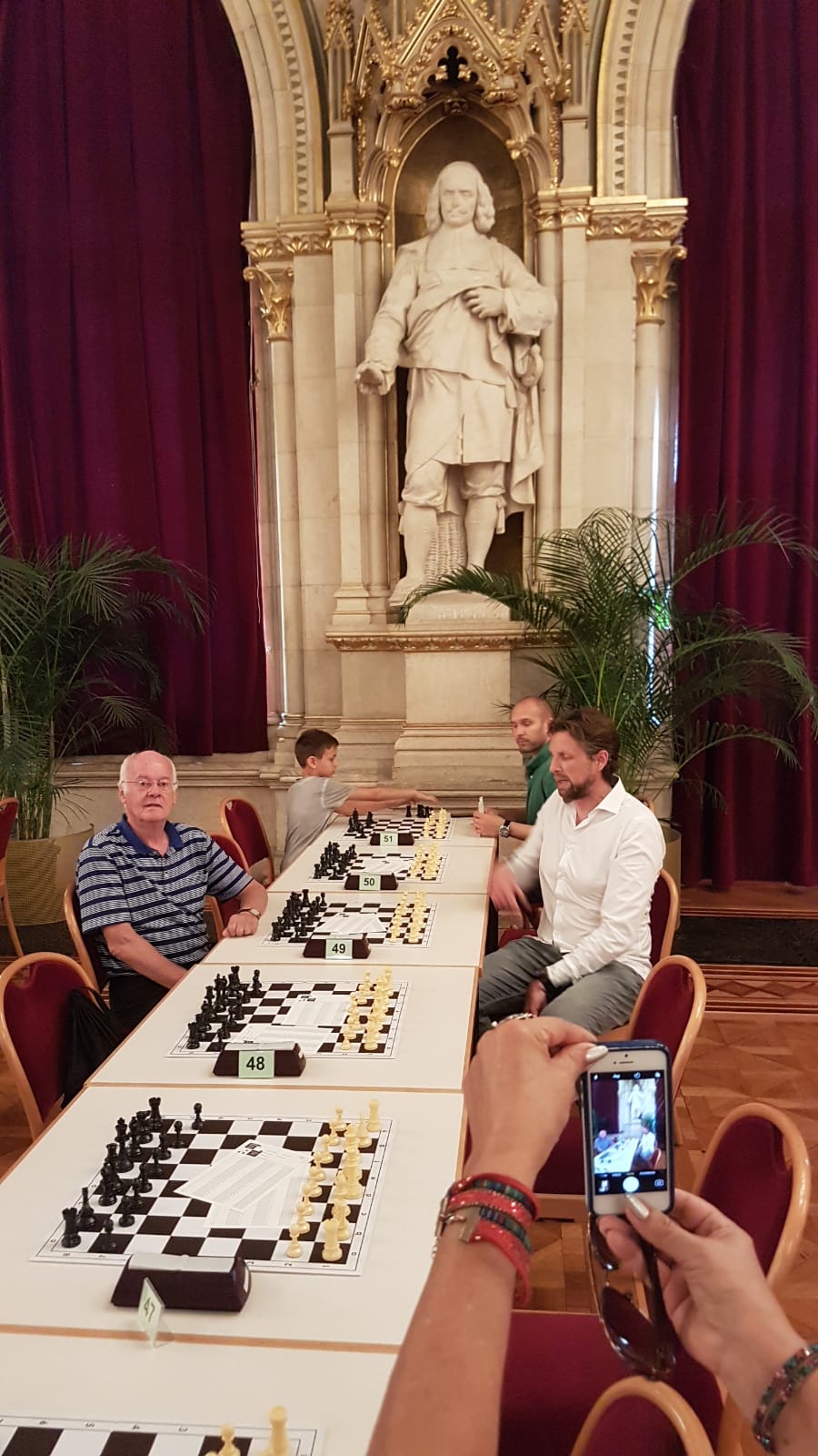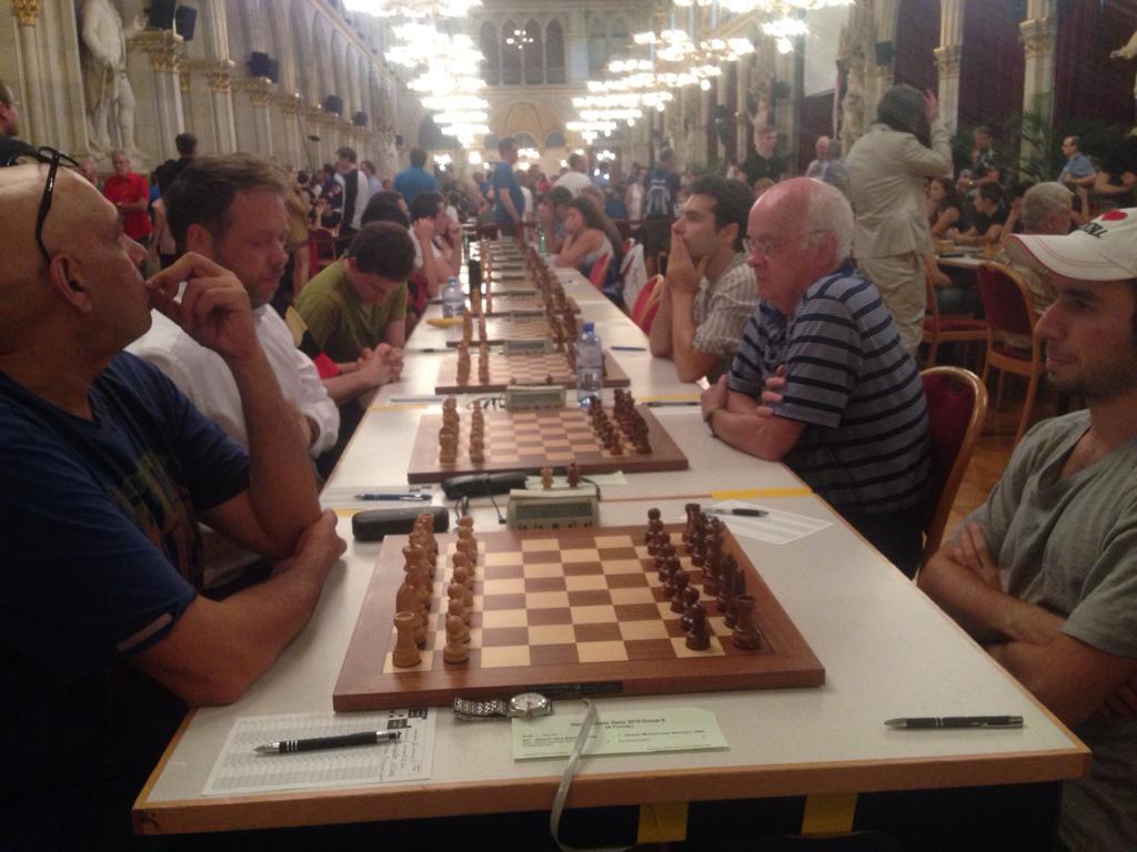.” Ronde 9:“Vandaag een mooi slotakkoord in de mooie Festsal van het Rathaus. Rens remise tegen 1950 en Bernard won een eindspel van een Griek met een moeilijke naam. De mental coaches Henk en Hans zorgden voor het water en de bananen.”Vienna Open 2019, Wenen