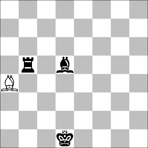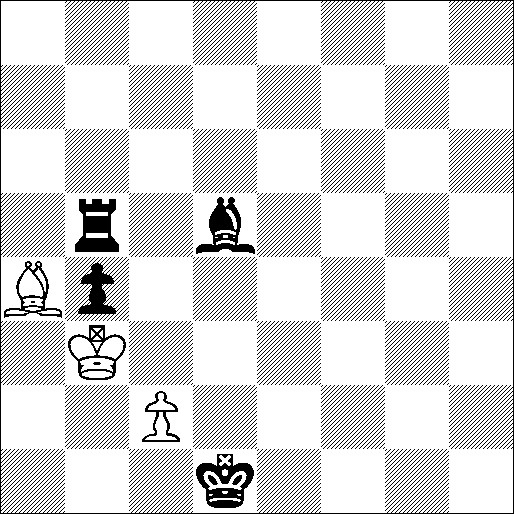 De eerste vraag is natuurlijk wie er aan zet is. Wit kan dat alleen met zijn koning op b3, maar wat zou dan zwarts laatste zet moeten zijn geweest? Dus zwart is aan zet. Maar hoe kan die loper op a4 dan schaakgeven? Hij kan niet over de toren op b5 heen zijn gesprongen, dus het moet een aftrekschaak zijn geweest. Dat kan alleen met de koning op b3 zijn gebeurd, dus staat de koning nu op a3 of c3. Toch lijkt dit niet te kunnen, want zwart zou dan zowel met zijn Tb5 als Ld5 tegelijk schaak hebben gegeven. Maar ….. er is één rare regel in het schaakspel die dat mogelijk maakt, juist … het “en passant”! En dan valt het kwartje, de uitgangsstelling moet als volgt zijn geweest: