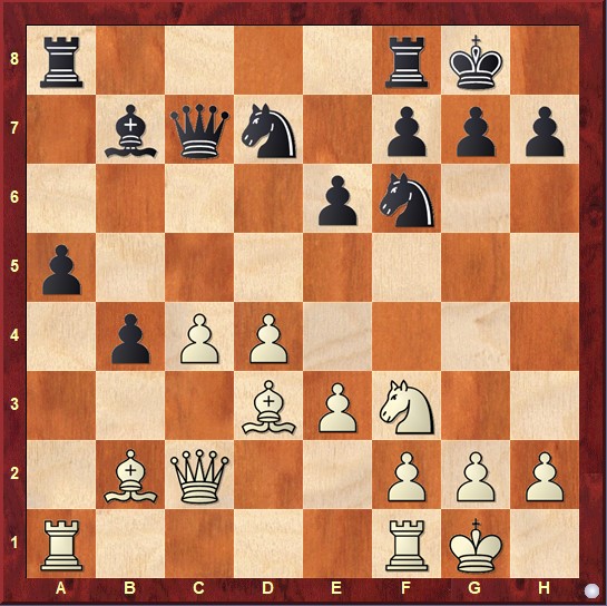 Joost: Ik kwam in het Nootenboom systeem van het damegambiet terecht: 1.d4 d5 2.c4 e6 3.Pc3 c6 4.Pf3 dxc4 5.e3 b5 6.a4 Lb4 7.axb5 cxb5 8.Ld2 Lxc3 9.Lxc3 a5 10.b3 Lb7 11.bxc4 b4 12.Lb2 Pf6 13.Ld3 0–0 14.Dc2 Dc7 15.0–0 Pbd7 (diagram) en nu ging ik in de fout met 16.Pe5 waarmee ik wel de pion op h7 won na 16…Pxe5 17.dxe5 Pd7 maar veld c5 kwam vrij voor het paard van d7 en mijn aanval op de koningschap sloeg niet door.