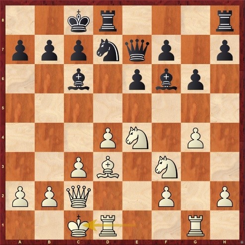 Henk speelde als enige Promotiaan tegen een lager gerate speler, al scheelde het niet veel. Henk: Ik speelde met zwart de Burn-variant van het Frans, dat leverde mij een solide stelling op, zie diagram. Alleen besloot ik een nogal riskante zet te spelen: 13. .. e5. En na het logische 14. Tge1 ook nog eens 14. .. dxe5. Dat kan toch niet goed zijn: de stelling openen wanneer de tegenstander een ontwikkelingsvoorsprong heeft en dit de tegenstander ook nog allerlei tactische dreigingen op de dame geeft? Maar ook de engine vindt het de beste variant voor zwart, en het pakte goed uit voor mij. In het middenspel werd mijn stelling steeds beter en kon ik afwikkelen naar een gewonnen toreneindspel.