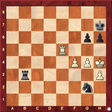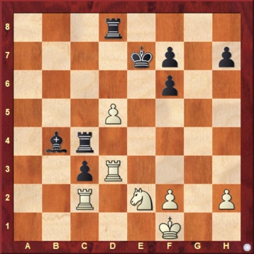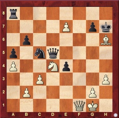 De eerste keer in mijn toch al 66 jaar oude leven dat ik tegen een echte GM speelde! Vooraf sprak ik mezelf dus alvast vermanend toe: “wees ook eens tevreden met remise!” In een boeiende Siciliaan verloor ik onbedoeld een kwaliteit, maar kreeg daardoor wel het beoogde tegenspel op de witte velden, dat resulteerde in winst van pion f7 en een sterke vrije e-pion. Na 33. Lxh6 Kh7 (niet gxh6 vanwege Df6+ en Pf5) ontstond de volgende stelling:
