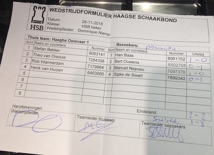 In de eerste ronde van de HSB-bekercompetitie heeft Promotie gisteren uit tegen Haeghe Ooievaar met 2 – 2 gelijkgespeeld, waarna het snelschaken met 1 – 3 werd gewonnen (winst op de borden 2 t/m 4).