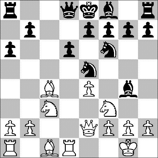 9. Td1 Pe5 (zie diagram)10. Pxe5 Lh5, 11. Dxh5 1-0