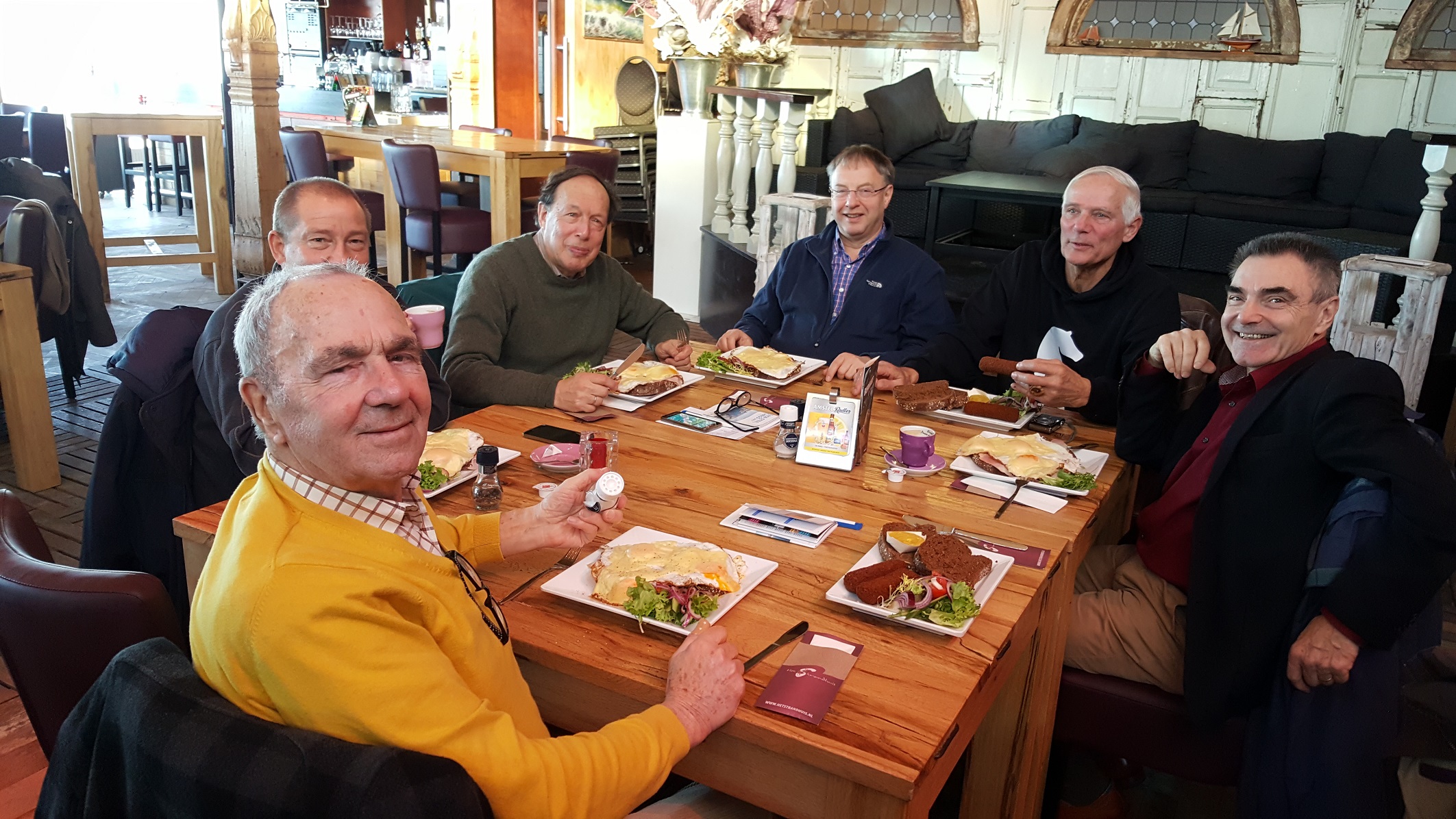 maar eerst, zoals altijd voor de 1e ronde, een uitsmijter (of “kroketten van Bob”) op het strand (Ed staat er niet op, want hij maakte de foto):