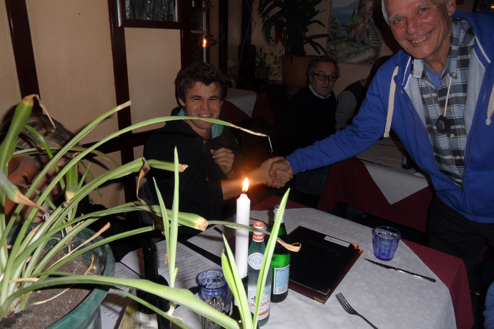 Chris en Martin hadden al “gewaarschuwd”: goede kans dat je daar naast Magnus Carlsen zit! Klopte helemaal, en Otto Boot (ontwerper van houten schaak-“dingetjes”) zag zijn kans schoon, en bood de King een koning aan!