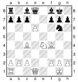 Onderstaand diagram deed zich voor in de partij van Bert Ouwens. Wit staat al heel goed. Zwart heeft zojuist Pe7-g6 gespeeld ipv cxd6. Dit gaf de kans voor een mooi offer Lxf7+!!