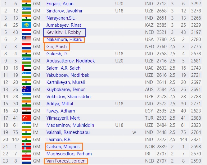 19 spelers met 3½ punt (o.a. Kevlishvili, Carlsen, van Foreest);