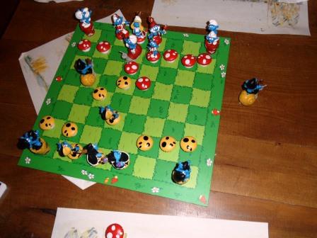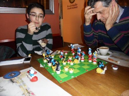– Gisteren hebben we – net als vorig jaar – weer met een grote groep gegeten in het Vissershuys (een aanrader!), op slechts 100 meter van de speelzaal; uiteraard is er daar weer Smurfenschaak gespeeld, deze keer door Robby en Ferdi, dus alweer (de) Kleine Smurf tegen (een) Grote Smurf – zie foto’s