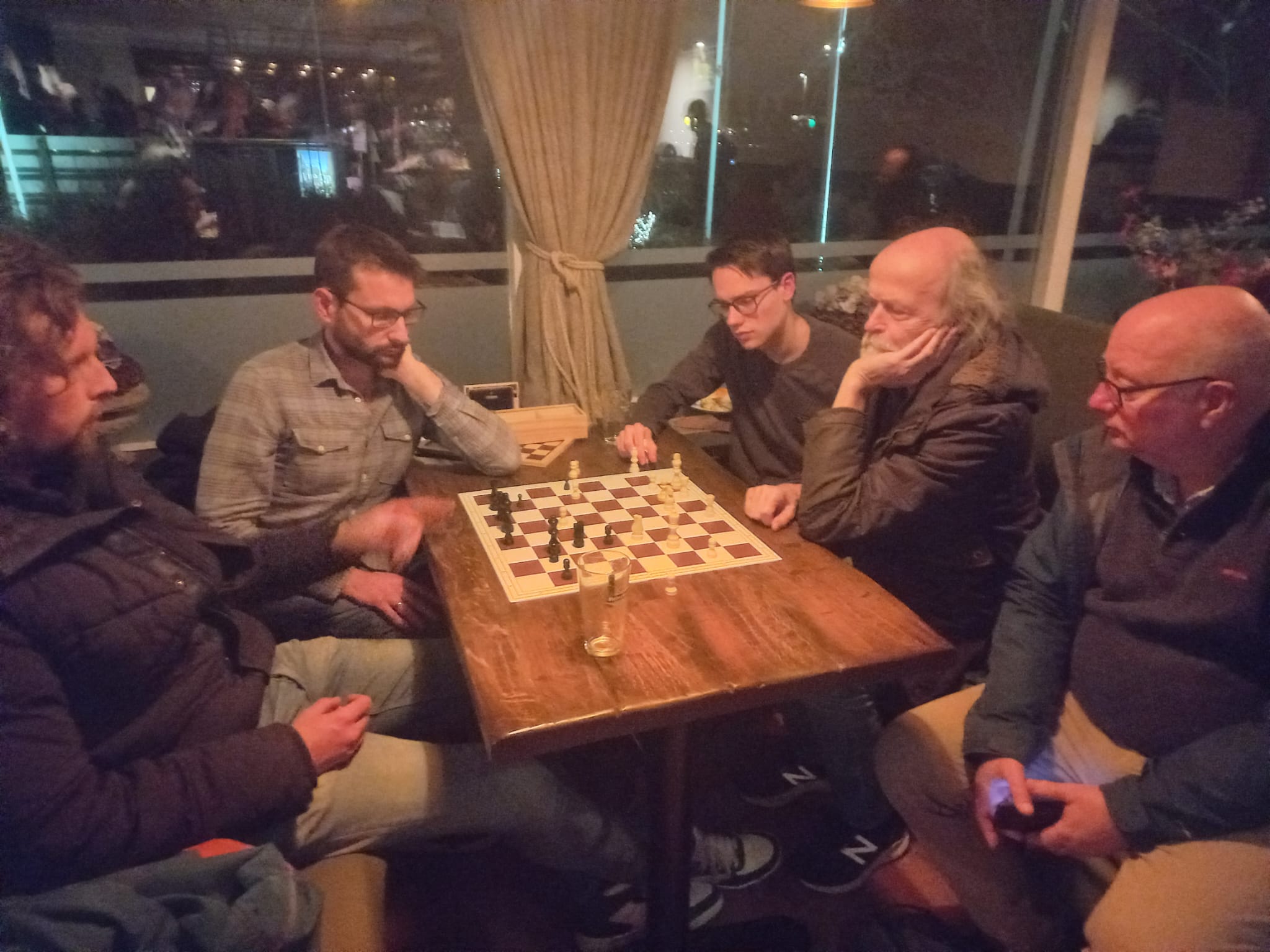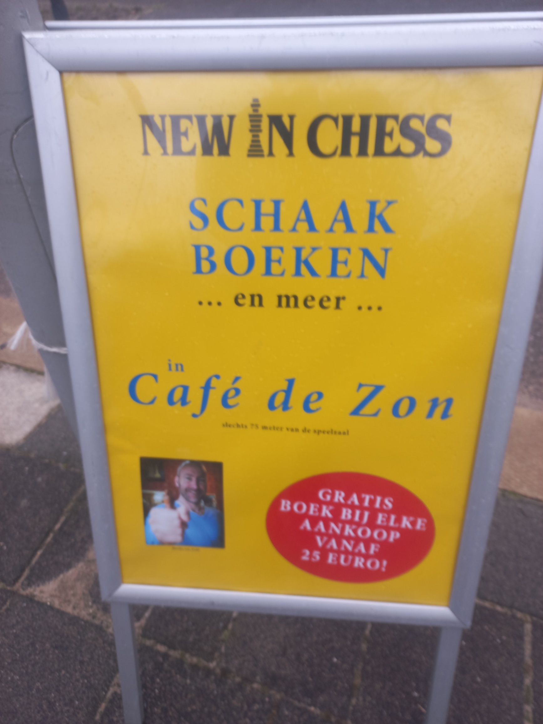 Links: het schaakboekwinkeltje in Café de Zon (waar ook het commentaar wordt gegeven) wordt nog steeds bemand door Merijn van Delft (linksonder op de foto), bekend als (ex-)trainer van Robby. Dat was vooral een paar jaar geleden handig, toen Robby bij Promotie was gekozen tot speler-van-het-jaar, en we hem bij het jaarlijkse etentje in het Vissershuys een cadeautje wilden geven: Merijn wist precies met welk boek we Robby een plezier konden doen! (PS: het Vissershuys is helaas niet meer…)