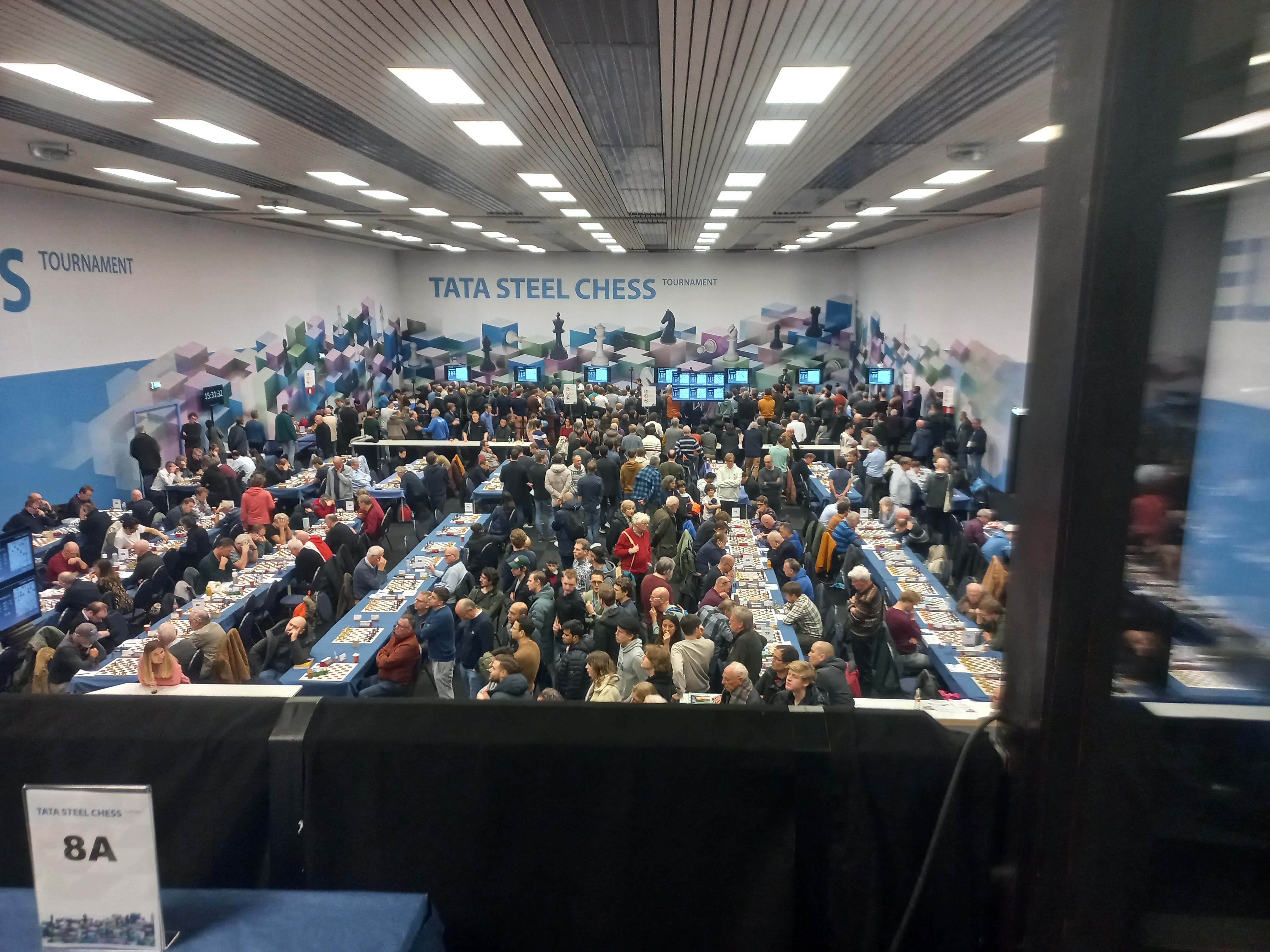 Rechts: wie denkt dat het zijzaaltje waar uw verslaggever speelt er niet echt bijhoort, die heeft het mis: wij zijn daar zelfs het “Main event”, volgens het bord in de hoek! De jongedame op de foto is trouwens Sophia, een van de dochters van GM Harmen Jonkman, tegen wie (de dochter) ik in de laatste ronde mag aantreden. Haar zus zit één groep hoger.