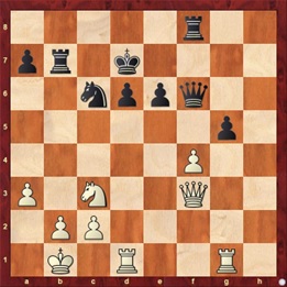 Het vervolg: 17. Kg2 Pce7, 18. Th1 f5, 19. f4 fxe4, 20. Pdxe4 d5!?. Weliswaar een vork, maar wit had (gezien door zwart!) 21. Pg5+. Een dilemma: als de zwarte koning naar h8 gaat dan blijft h6 gepend, en als hij naar g8 gaat dan staat hij weer op de diagonaal van Lc4. Bovendien is Pe7 overbelast: het moet zowel Pg6 dekken tegen Dxg6, maar ook pion d5. Zwart koos (terecht?) 21. … Kg8, waarop volgde 22. Pxd5 Pxd5, 23. Dxg6 hxg5. En zwart heeft een stuk meer! Maar: 24. Th7 Tf7. Nu was wit zo bang voor het (redelijk unieke?) verlies van twee lopers door één paard (Pxe3+ gevolgd door Pxc4), dat hij de winnende zet miste (zoals Henk A na afloop fijntjes aantoonde): 25. Tah1! Hij speelde 25. Lf2, waarna zwart dacht de partij te beslissen met 25. … Lf5. Maar helaas had wit nog 26. Th8+ Kxh8, 27. Dxf7, en dreigde daarmee 28. Th1+. Dat werd verhinderd door 27. … Le4+, en waar de witte koning ook heen gaat, hij staat altijd zijn a-toren in de weg (en Lf4 bestrijkt bovendien veld h1). 28. Kh2 gxf4, 29. Dh5+ Kg8, 30. gxf4 c6, en dit won zwart uiteindelijk.