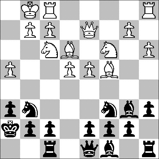 Na zet 13 (Pe7-c6) van zwart overzag wit dat h4 nu twee maal werd aangevallen, en speelde 14. Dd3, met een dreigende penning van Pg6 (en dan h4-h5). De zwarte koning was trouwens al eerder naar h7 gegaan vanwege de penning van pion f7 door Lc4 (en ook om pion h6 te dekken toen de witte dame nog op d2 stond). Nu kon zwart 14. … Pxh4 doen, ook nog Pxf3 dreigend. Dus speelde wit 15. Pd2, en kon zwart eindelijk wat (proberen te) ontwikkelen: 15. … d6. Toen kwam 16. g3, en zwart overwoog even 16. … Lh3, 17. gxh4 Dxh4, maar het dreigende Dg4 kon wit dan verhinderen met De2. Dus toch maar 16. … Pg6.