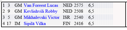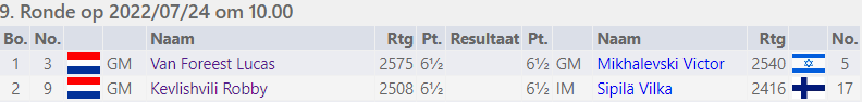 za 23/7 12:00 11:00 5 z Tarvo Seeman #18 IM Est 2410 1 6½ 81,3 1-4 2594 9 zo 24/7 10:00 09:00 2 w Sipila Vilka #17 IM Fin 2416 1 7½ 83,3 1-2 2624 Toernooi-info: