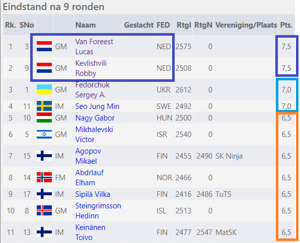 Ronde 7: Remise tegen #2, dus nu 5½ uit 7. Er zijn nu 9 spelers met 5½, achter de ene koploper met 6, Lucas van Foreest.