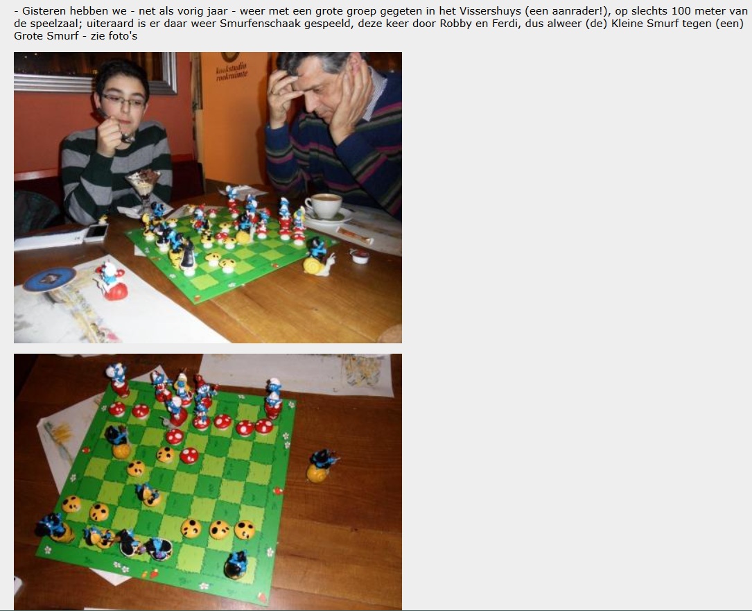 Harrie Boerkamp blijkt een beter geheugen te hebben (en is bij deze genomineerd voor de functie van webredacteur). Zijn reactie: “In ’t Vissershuys in Wijk aan Zee hadden ze een smurfenschaakspel. Robby speelde tegen Rens op 25 januari 2013. En een jaar later tegen Ferdi. Daar staan nog foto’s van op onze site.”