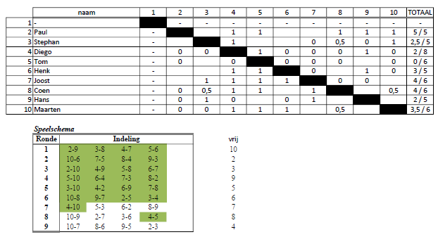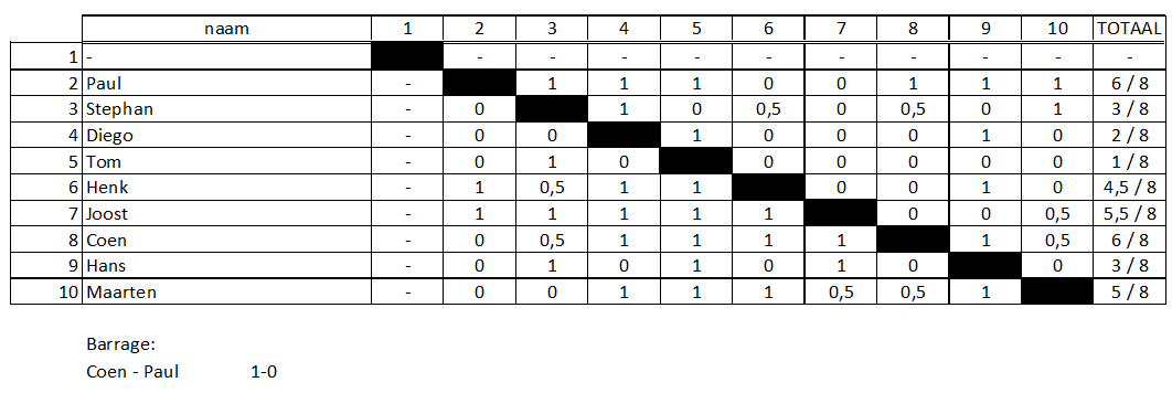 De finalegroep van het rapidtoernooi had een erg spannende ontknoping. Paul startte de laatste avond met 5 uit 5 en leek de groep ogenschijnlijk eenvoudig te gaan winnen. Het liep anders. Twee nederlagen tegen Henk en Joost maakte het weer spannend. Een overwinning in de laatste ronde tegen Stephan leek genoeg. Totdat Coen in het eindspel Henk wist te verrassen met mat. Daardoor eindigden Coen en Paul beiden op 6 punten.