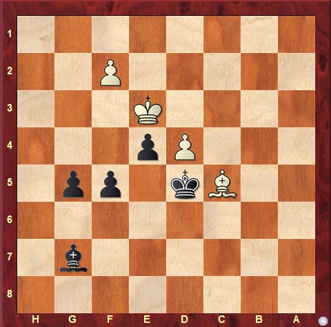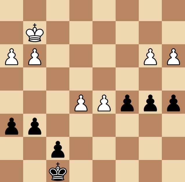 In reactie daarop creëerde Stephan twee potentiële vrijpionnen. Na Stephans b5 is wits beste zet nu Kf3. Wit verrekende zich: a4 c4; bxc4 bxa4 met de volgende voor Stephan winnende stelling.