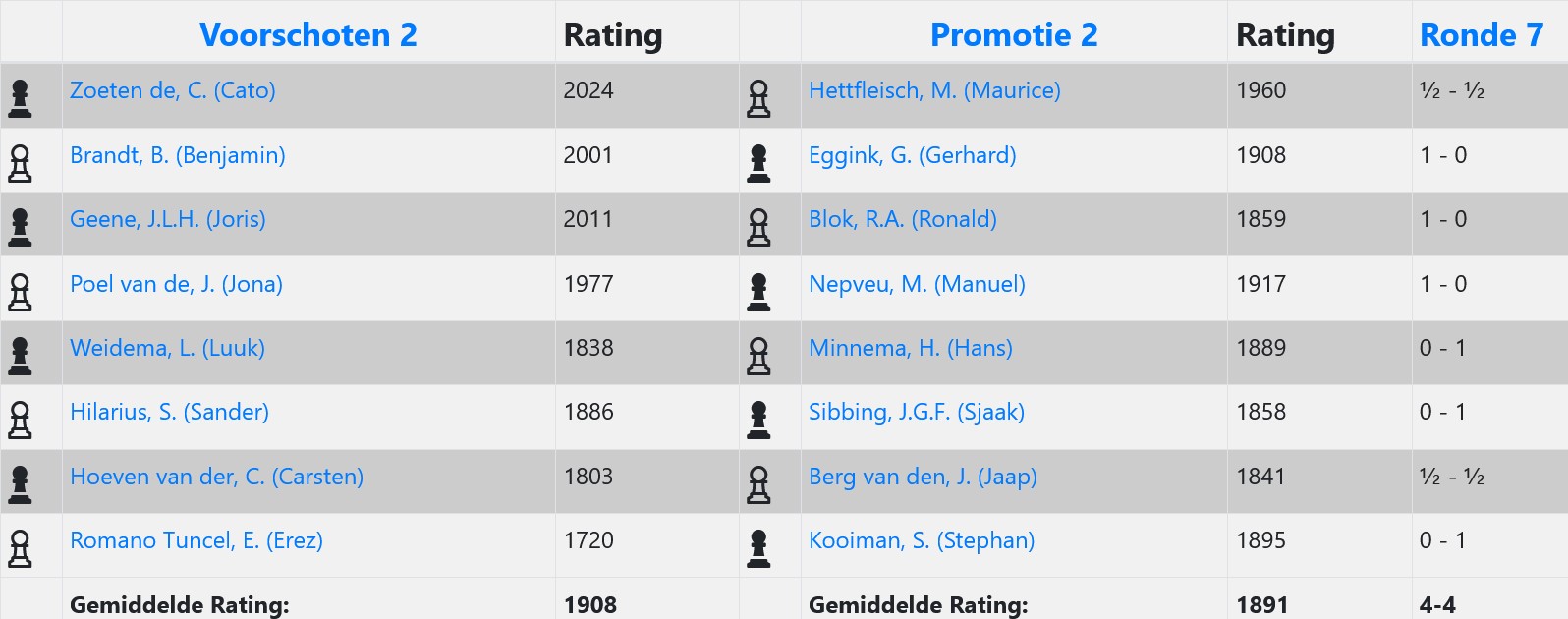 Daardoor werd het 4 – 4. Promotie 2 lijkt hiermee veilig tegen degradatie. De volgende ronde is vrij en in de slotronde wordt tegen AAS 1 gespeeld.