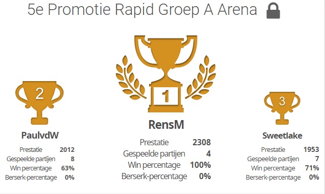 (Rens) – Steeds meer schaakclubs weten de weg naar de teambattle te vinden. Zodoende wordt de 2e klasse waarin we spelen sterker en sterker. Op rating zijn we 4e geplaatst, de eerste 2 promoveren, de onderste degraderen. Van de eerste zeven teamleden worden de punten opgeteld, dit totaal bepaalt de eindstand. Promotie komt precies met 7 spelers, wat krap is, iedereen moet dan in vorm zijn. Er is nieuw bloed, FM Sillymanofwar is erbij, en natuurlijk Arie weer, Hielke, Maurice, Willem, Jaap en ondergetekende. Gaandeweg het toernooi zakken we steeds wat verder weg, Arie doet het goed, bij Silly zit er wat zand in de moter, Willem wint ongeveer wat hij moet winnen, wel remise tegen 2300, Hielke komt als een komeet uit de startblokken en haalt een hoge TPR, Maurice scoort constant, Jaap heeft vooral wat opstartproblemen, zelf doe ik ongeveer wat gedaan moet worden, maar niet echt tevreden. Al met al niet zo verkeerd, alleen de klasse is zo sterk geworden dat we op het einde toch een na laatste staan en degraderen naar de 3e klasse. Het schaken blijft net zo leuk, dus graag tot komende zondag, we gaan dan Promoveren!