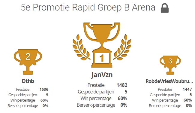 Het verschil tussen Bernard en Arie is vandaag vooral, de streaks. Bernard blijft liefst 16 partijen ongeslagen voordat hij een nul moet accepteren. Arie die uiteindelijk bijna tot hetzelfde winstpercentage komt, wordt in zijn winstreeks een paar keer ruw onderbroken, door de man die eveneens op het podium belandt met een TPR van 2200, Hielke. Hij beleeft een uitstekende avond, voorzien van bier.